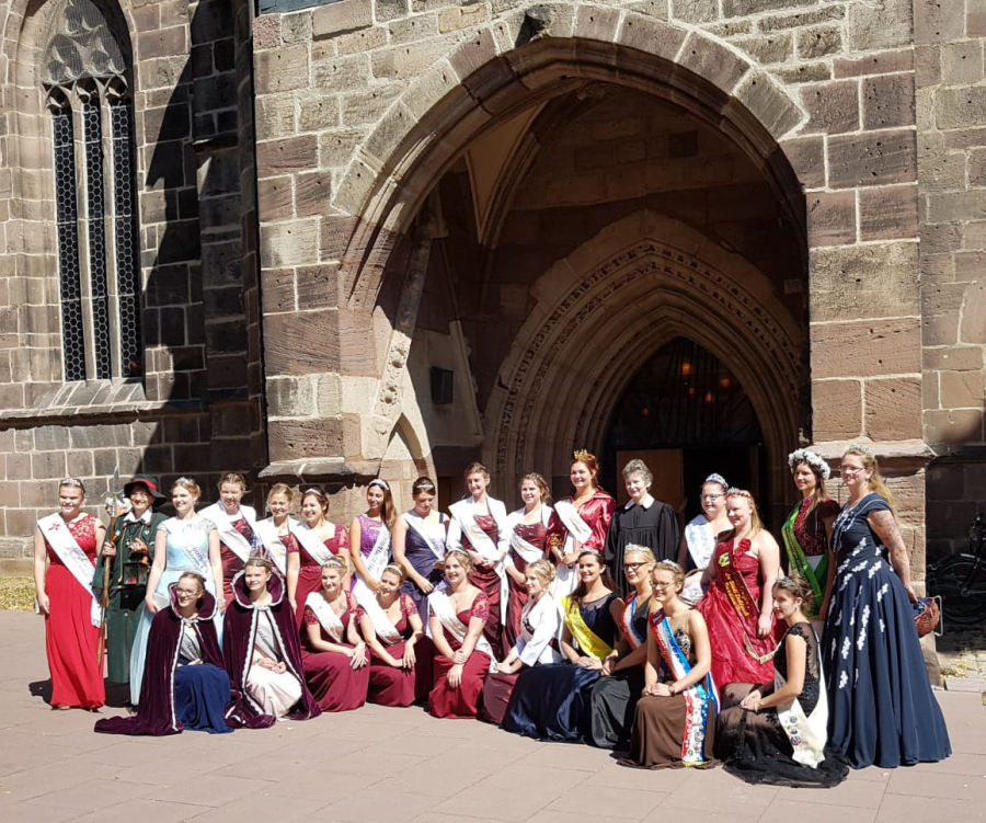 Nach dem Gottesdienst stellten sich die scheidende Kirschkönigin Tarah I. mit ihren Prinzessinnen, die Kandidatinnen für die 52. Kirschkönigin und die Gasthoheiten mit Dekanin Ulrike Laakmann vor dem Kirchenportal zum Gruppenfoto auf.